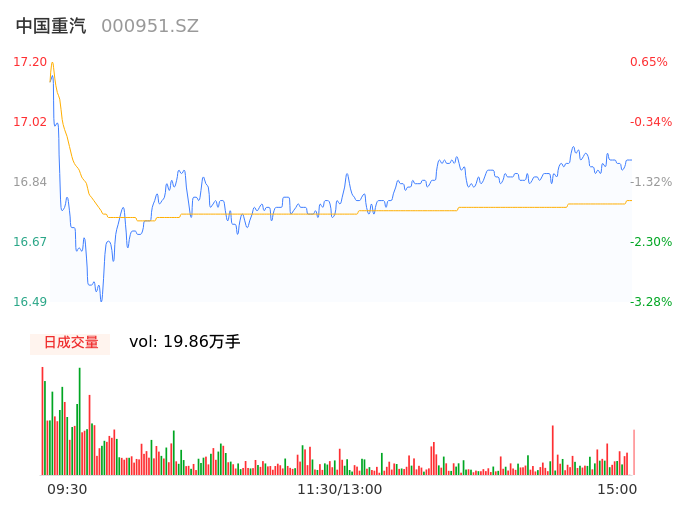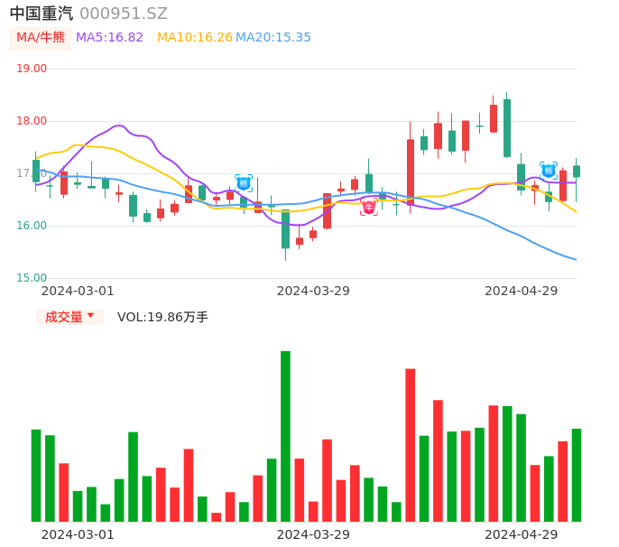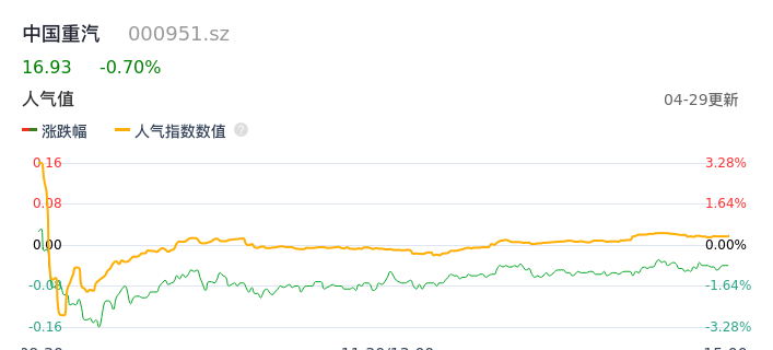 04月29日,中国重汽收报16.93,股价涨幅-0.70%,成交金额3.33亿元,换手率1.69%。