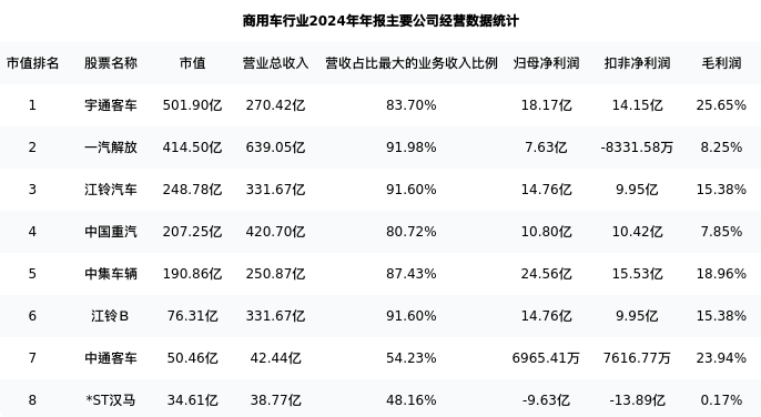 中国重汽最新报告期数据为年报,下表汇总了商用车行业内市值靠前的公司年报主要经营数据
