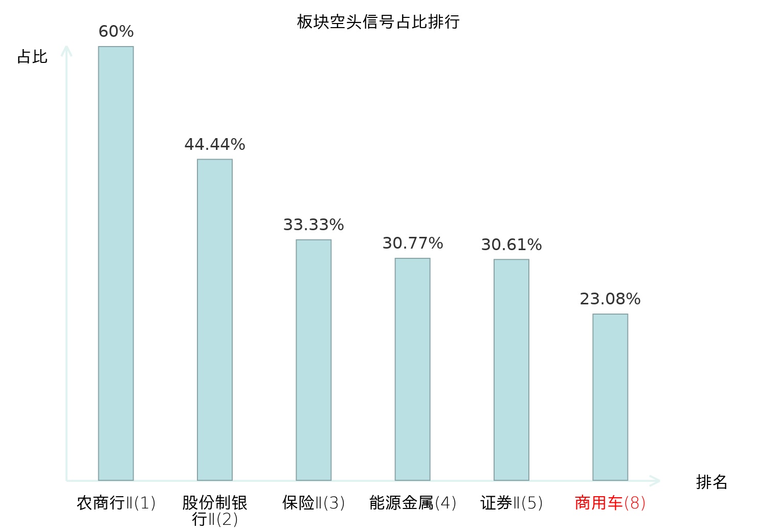 全市场所有行业板块中主力空头信号占比排名中,农商行Ⅱ板块位居第一。证券Ⅱ板块名次提升最快,较昨日上升119位。