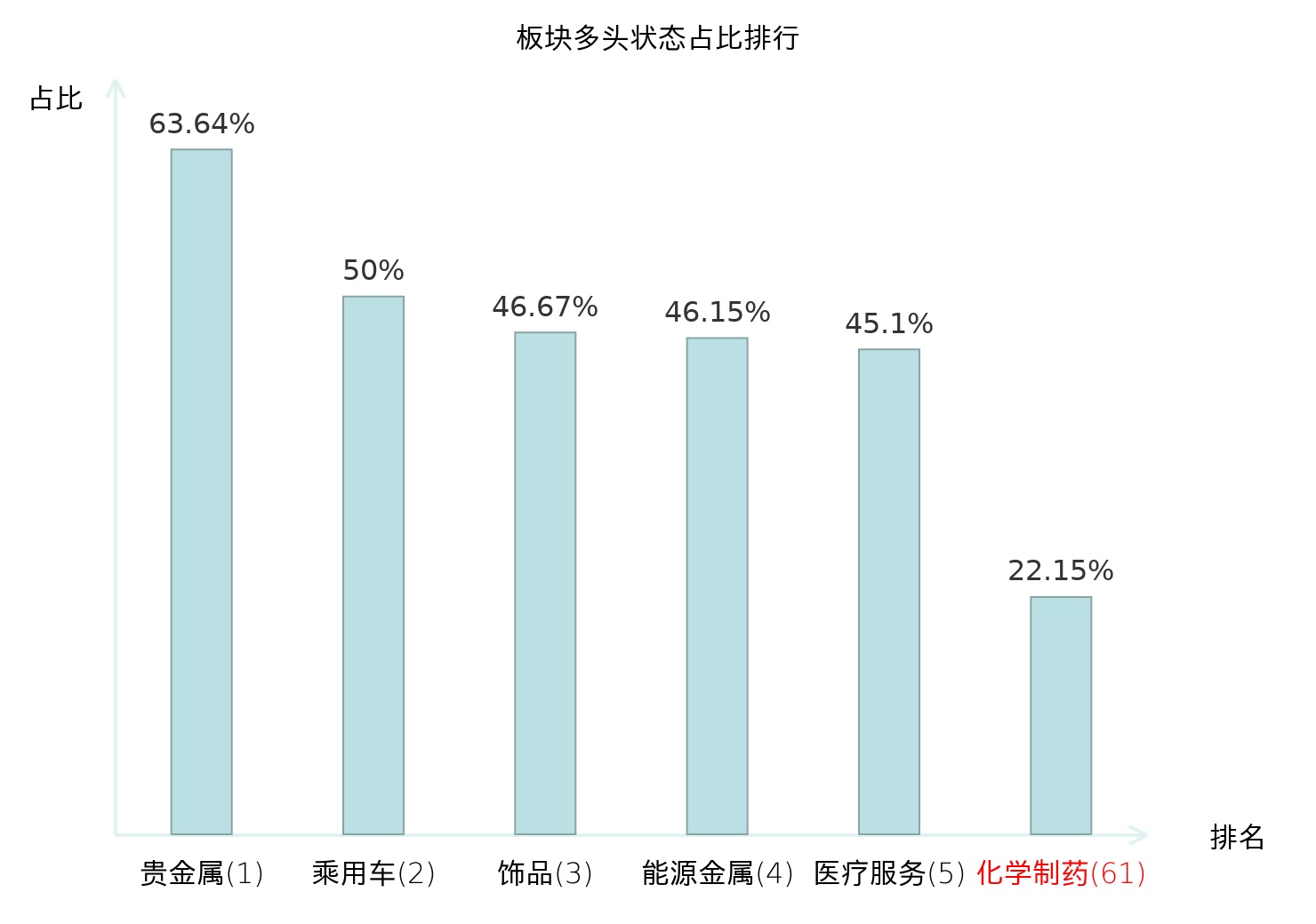 全市场所有行业板块中主力多头状态占比排名中,贵金属板块位居第一。电机Ⅱ板块名次提升最快,较昨日上升61位。