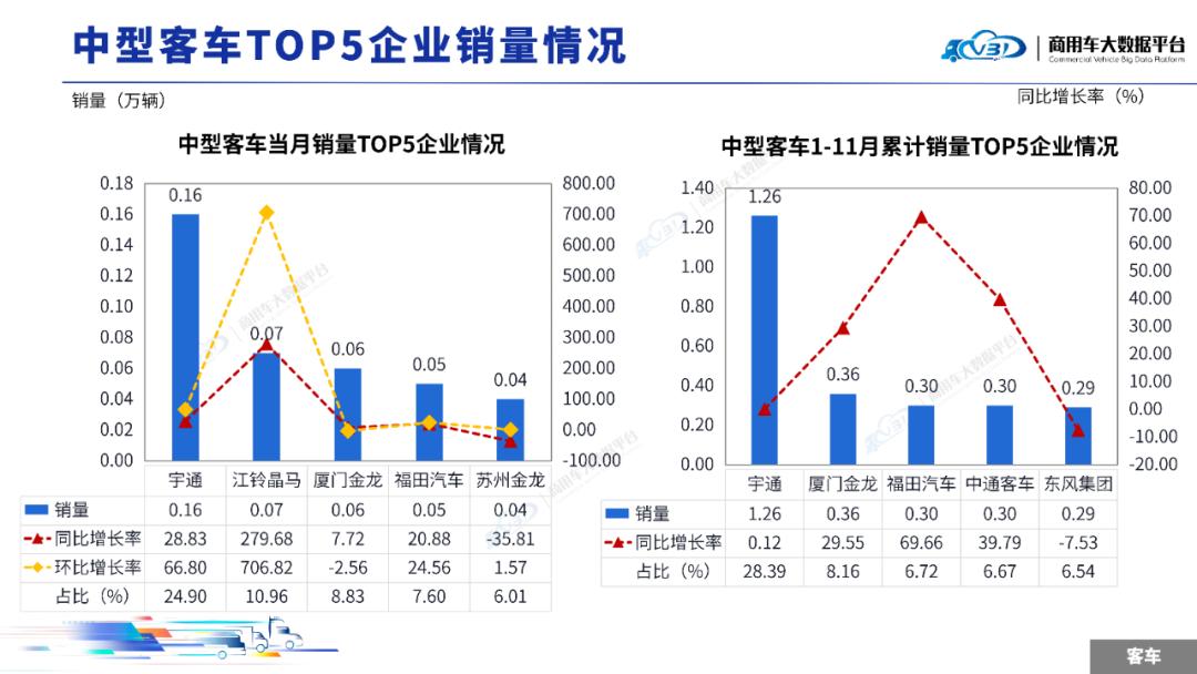 当月中型客车销量(批发)TOP5企业占比58.30%,依次为宇通、江铃晶马、厦门金龙、福田汽车、苏州金龙。1-11月中型客车累计销量(批发)TOP5企业占比56.48%,依次为宇通、厦门金龙、福田汽车、中通客车、东风集团。