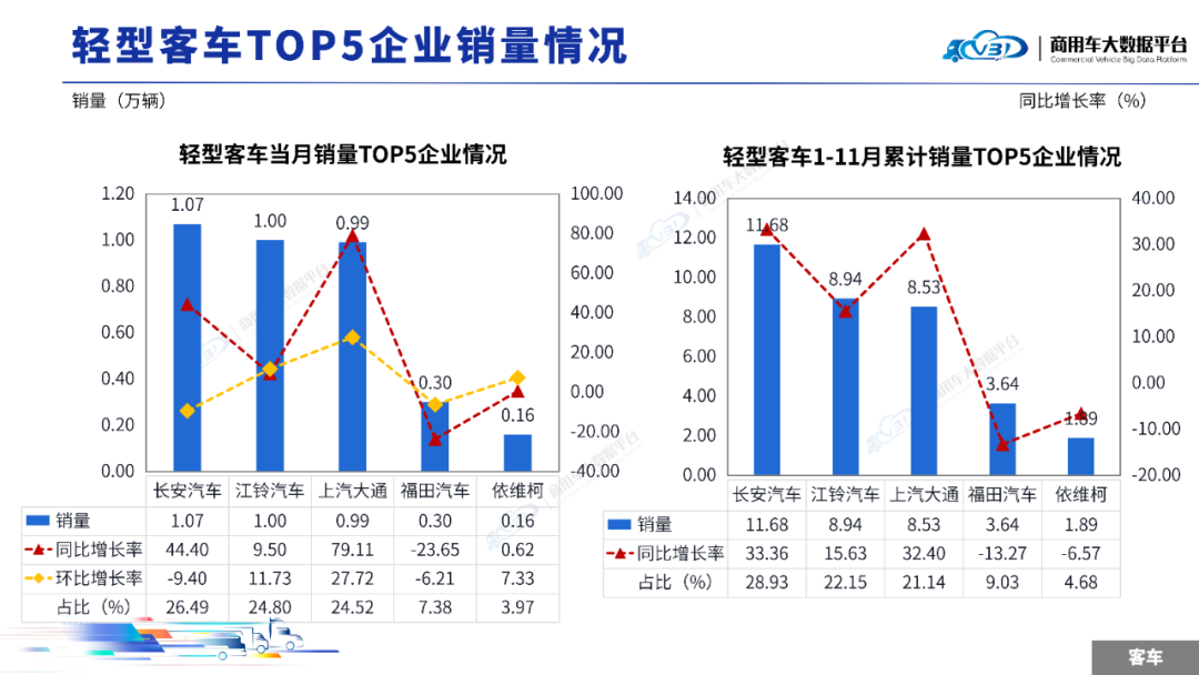 1-11月轻型客车累计销量(批发)TOP5企业占比85.93%,依次为长安汽车、江铃汽车、上汽大通、福田汽车、依维柯。