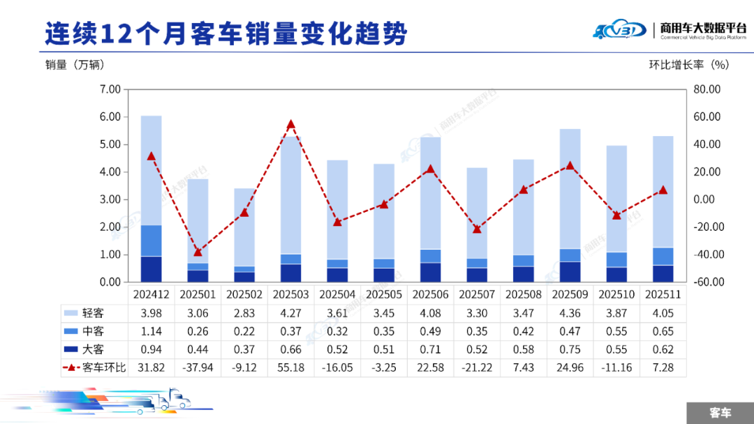智通财经APP获悉,中国汽车流通协会数据显示,2025年11月全国客车销量(批发)为5.32万辆,同比增长15.78%,环比增长7.28%;1-11月累计销量(批发)为51.01万辆,同比增长10.67%。