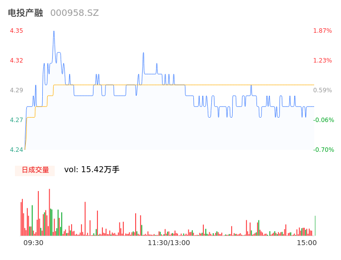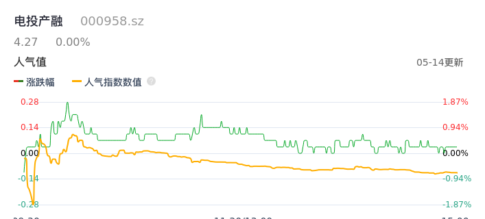 05月14日,电投产融收报4.27,股价涨幅0.00%,成交金额6623.79万元,换手率0.29%。