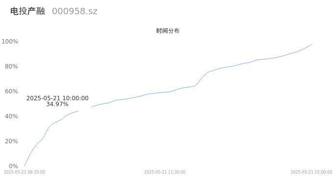 000958电投产融2025年05月21日成交123.59万手,成交金额9.20亿,相较昨日缩量64.87万手,换手率2.30%,成交清淡。