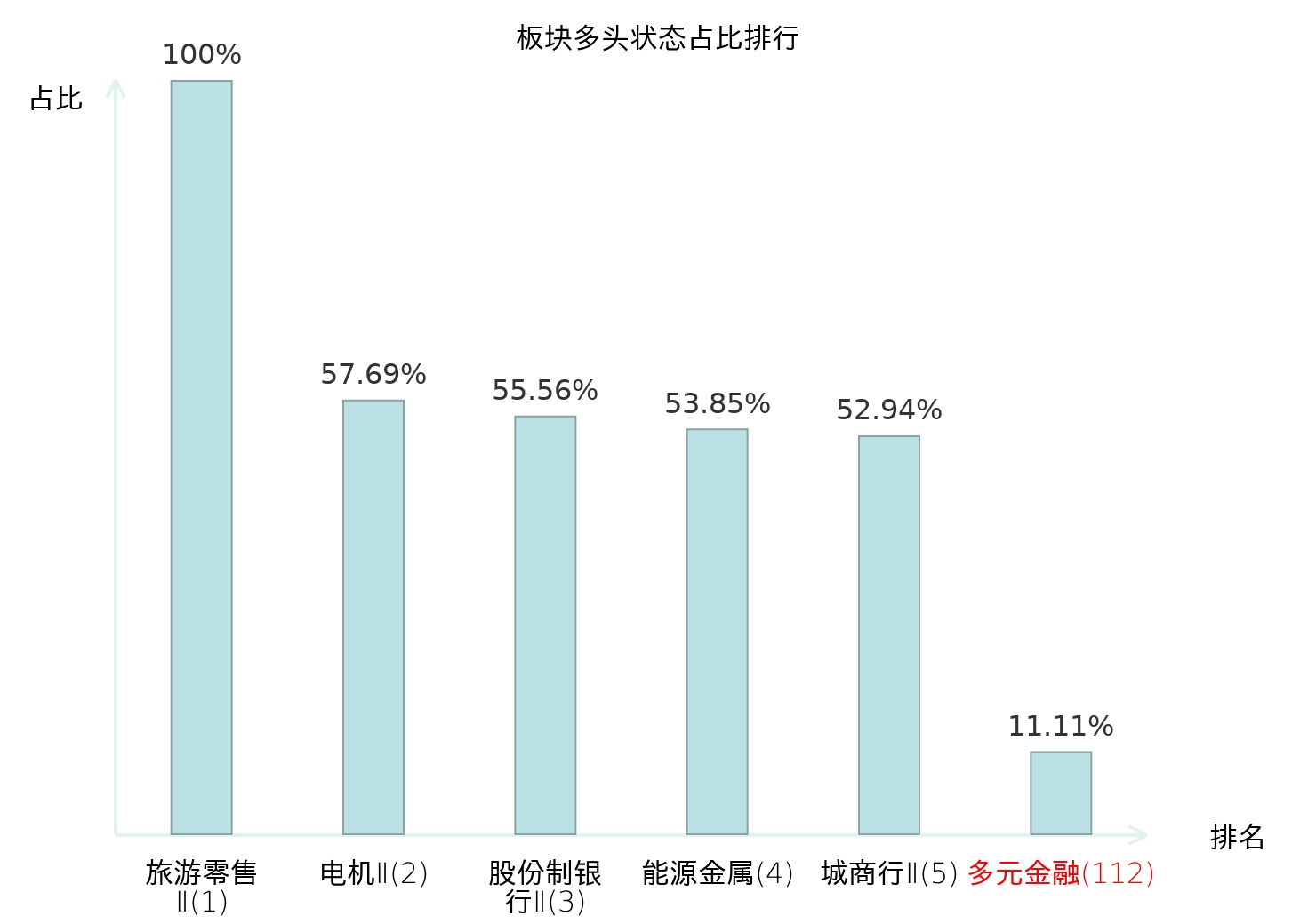 全市场所有行业板块中主力多头状态占比排名中,旅游零售Ⅱ板块位居第一。地面兵装Ⅱ板块名次提升最快,较昨日上升99位。