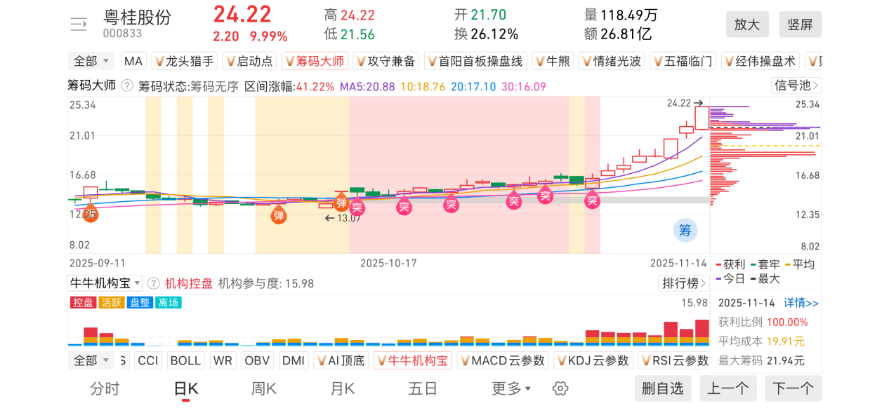 2)20251114-粤贵股份-000833-【筹码大师】和【牛牛机构宝】-近期出现弹信号且底部量柱由绿转红