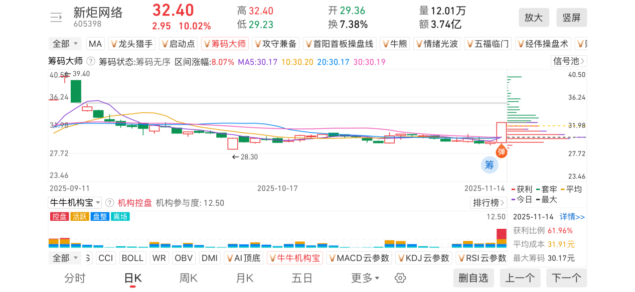 3)20251114-新炬网络-605398-【筹码大师】和【牛牛机构宝】-近期出现弹信号且底部量柱由绿转红