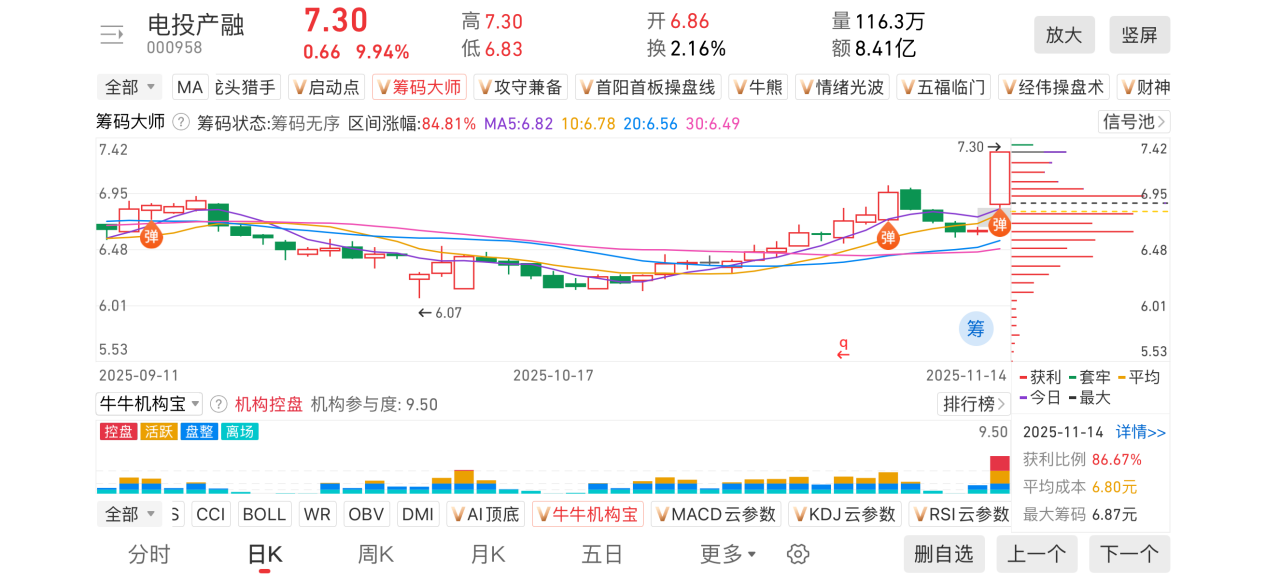 1)20251114-电投产融-000958-【筹码大师】和【牛牛机构宝】-近期出现弹信号且底部量柱由绿转红