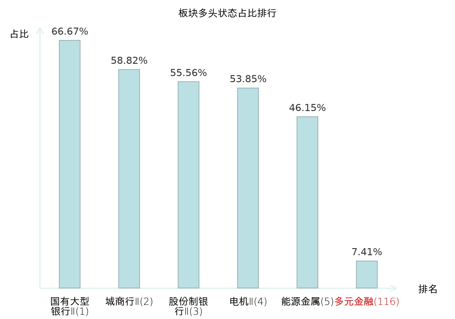 全市场所有行业板块中主力多头状态占比排名中,国有大型银行Ⅱ板块位居第一。自动化设备板块名次提升最快,较昨日上升57位。
