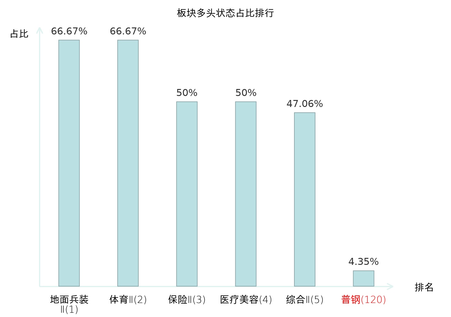 全市场所有行业板块中主力多头状态占比排名中,地面兵装Ⅱ板块位居第一。保险Ⅱ板块名次提升最快,较昨日上升82位。