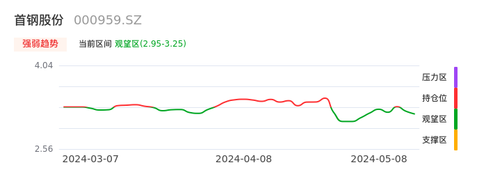 我们来看一下该股的九方特色指标强弱趋势的情况:首钢股份近日从持仓区下穿到观望区,股价出现持续性调整行情。短期已经转为空头行情,且下跌动能仍未衰竭。建议继续谨慎观望。