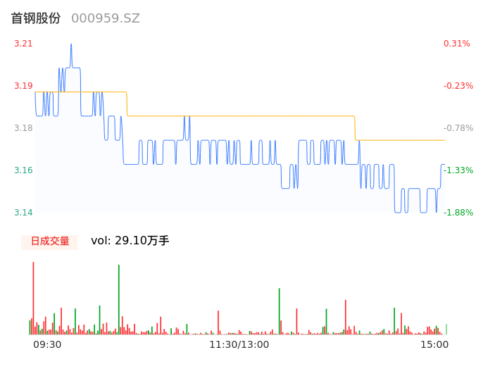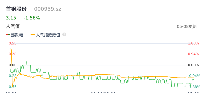 05月08日,首钢股份收报3.15,股价涨幅-1.56%,成交金额9225.17万元,换手率0.48%。