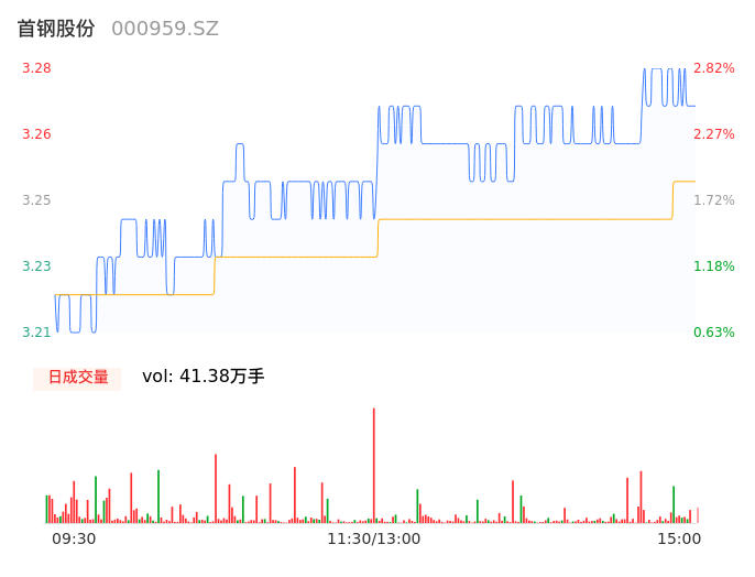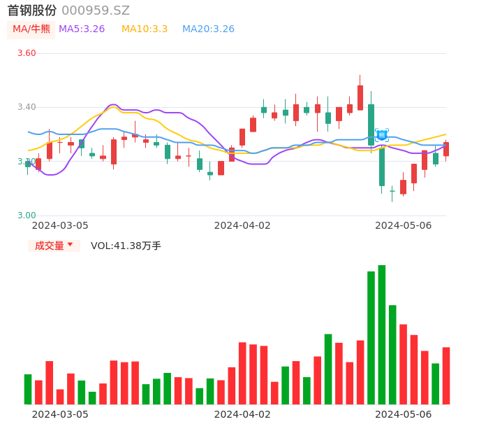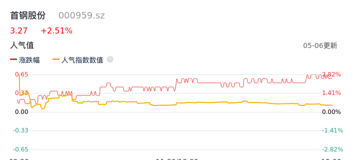05月06日,首钢股份收报3.27,股价涨幅2.51%,成交金额1.34亿元,换手率0.69%。