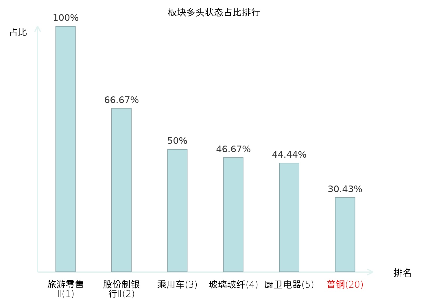全市场所有行业板块中主力多头状态占比排名中,旅游零售Ⅱ板块位居第一。农产品加工板块名次提升最快,较昨日上升72位。