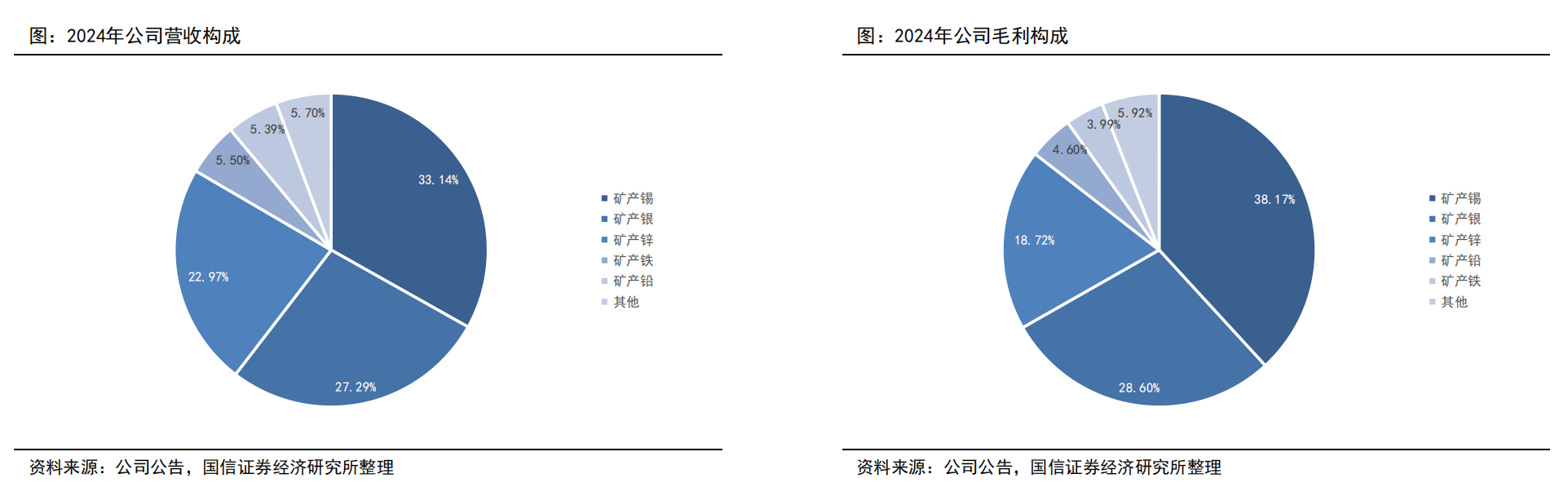 公司下属矿山多为多金属矿,因此矿种较多,外售产品包括矿产银、锡、铅、锌、锑、铜、铁、铋、金等,其中在营收和毛利中占比最大的为锡、银、锌三种金属。2024年,锡/银/锌在营收中的占比分别为35.9%/26.9%/19.2%;在毛利中的占比分别为43.9%/26.6%/14.8%。