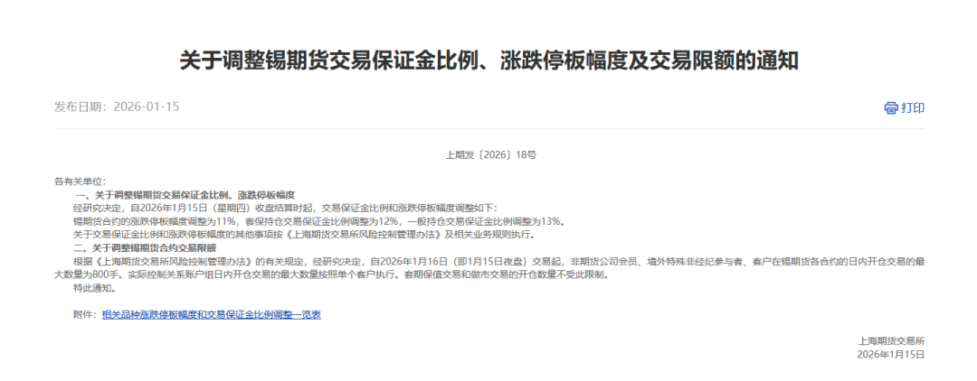 根据通知,自2026年1月15日(星期四)收盘结算时起,锡期货合约的涨跌停板幅度调整为11%,套保持仓交易保证金比例调整为12%,一般持仓交易保证金比例调整为13%。自2026年1月16日(即1月15日夜盘)交易起,非期货公司会员、境外特殊非经纪参与者、客户在锡期货各合约的日内开仓交易的最大数量为800手。实际控制关系账户组日内开仓交易的最大数量按照单个客户执行。套期保值交易和做市交易的开仓数量不受此限制。