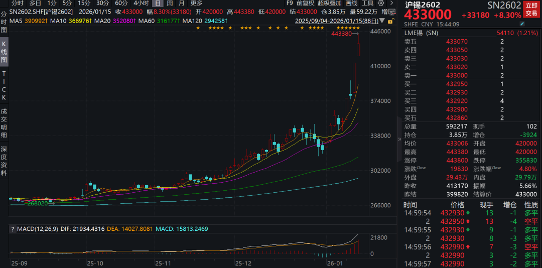 沪锡期货开年以来连续上行,主力SN2602合约1月12日、1月14日两日都收盘涨停,截至1月15日收盘,仅半个月时间累计涨幅就达33%。