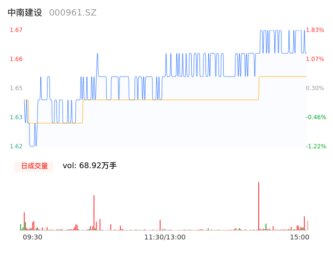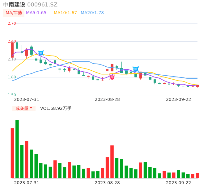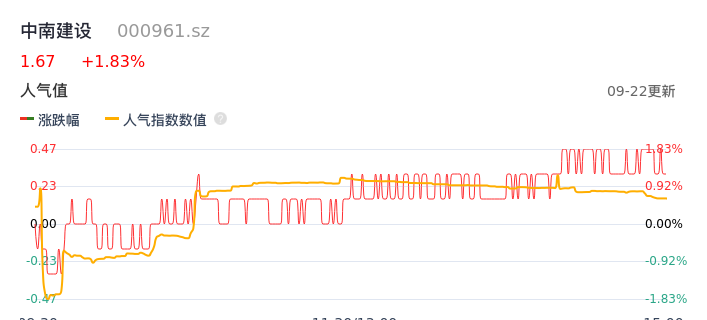 09月22日,中南建设收报1.67,股价涨幅1.83%,成交金额1.14亿元,换手率1.81%。