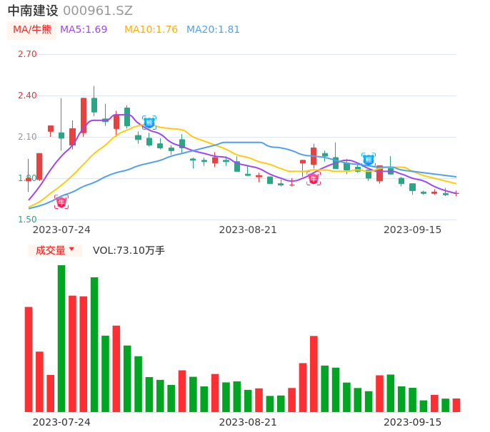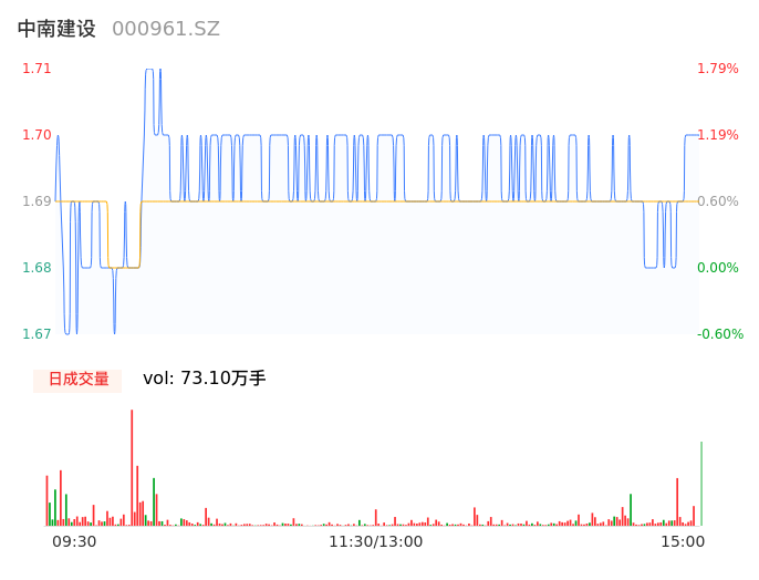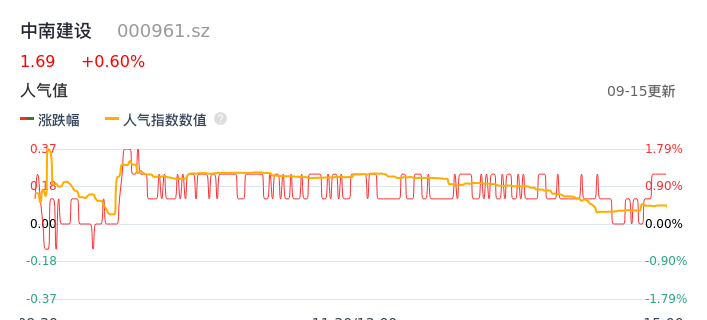 09月15日,中南建设收报1.69,股价涨幅0.60%,成交金额1.24亿元,换手率1.92%。