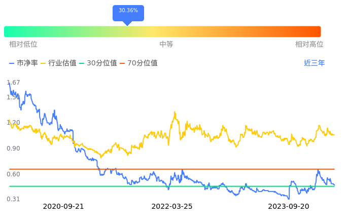 中南建设当前市净率PB为0.47,在所属的房地产开发中,市净率PB排6,前五名分别为ST世茂市净率0.31、金融街市净率0.36、福星股份市净率0.39、荣盛发展市净率0.39、绿地控股市净率0.42。中南建设当前市净率PB为0.47,超过近3年30.36%的历史数据。