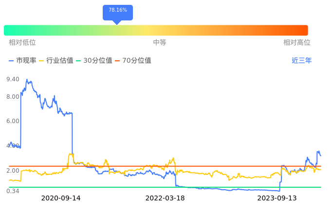 2023年09月14日,中南建设下跌1.18%收于1.68,今日成交金额1.22亿元。下文将从市盈率PETTM、市净率PB、市现率3个角度去分析公司估值情况。