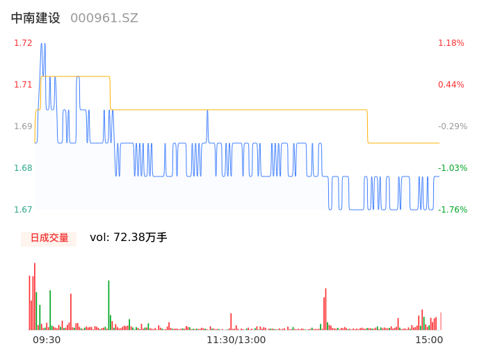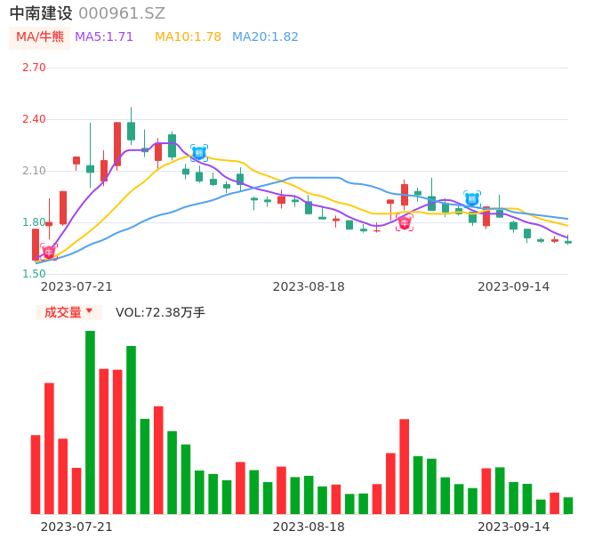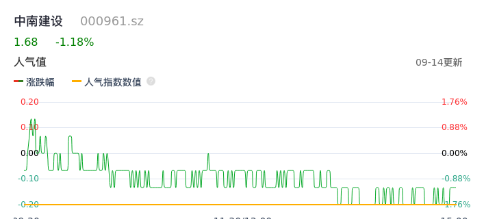 09月14日,中南建设收报1.68,股价涨幅-1.18%,成交金额1.22亿元,换手率1.90%。