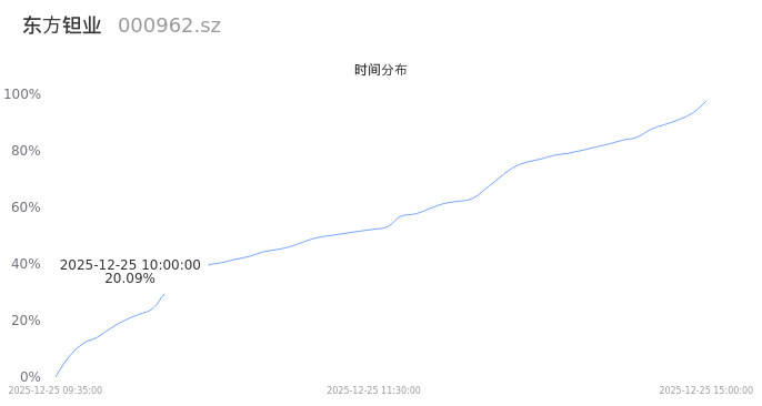 000962东方钽业2025年12月25日成交16.76万手,成交金额5.04亿,相较昨日缩量3.01万手,换手率3.34%,成交清淡。