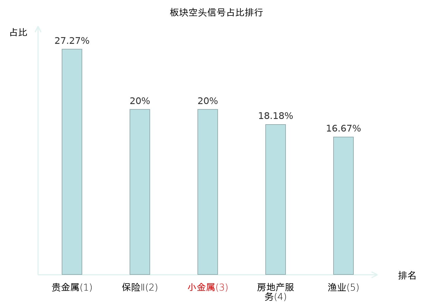 全市场所有行业板块中主力空头信号占比排名中,贵金属板块位居第一。小金属板块名次提升最快,较昨日上升117位。