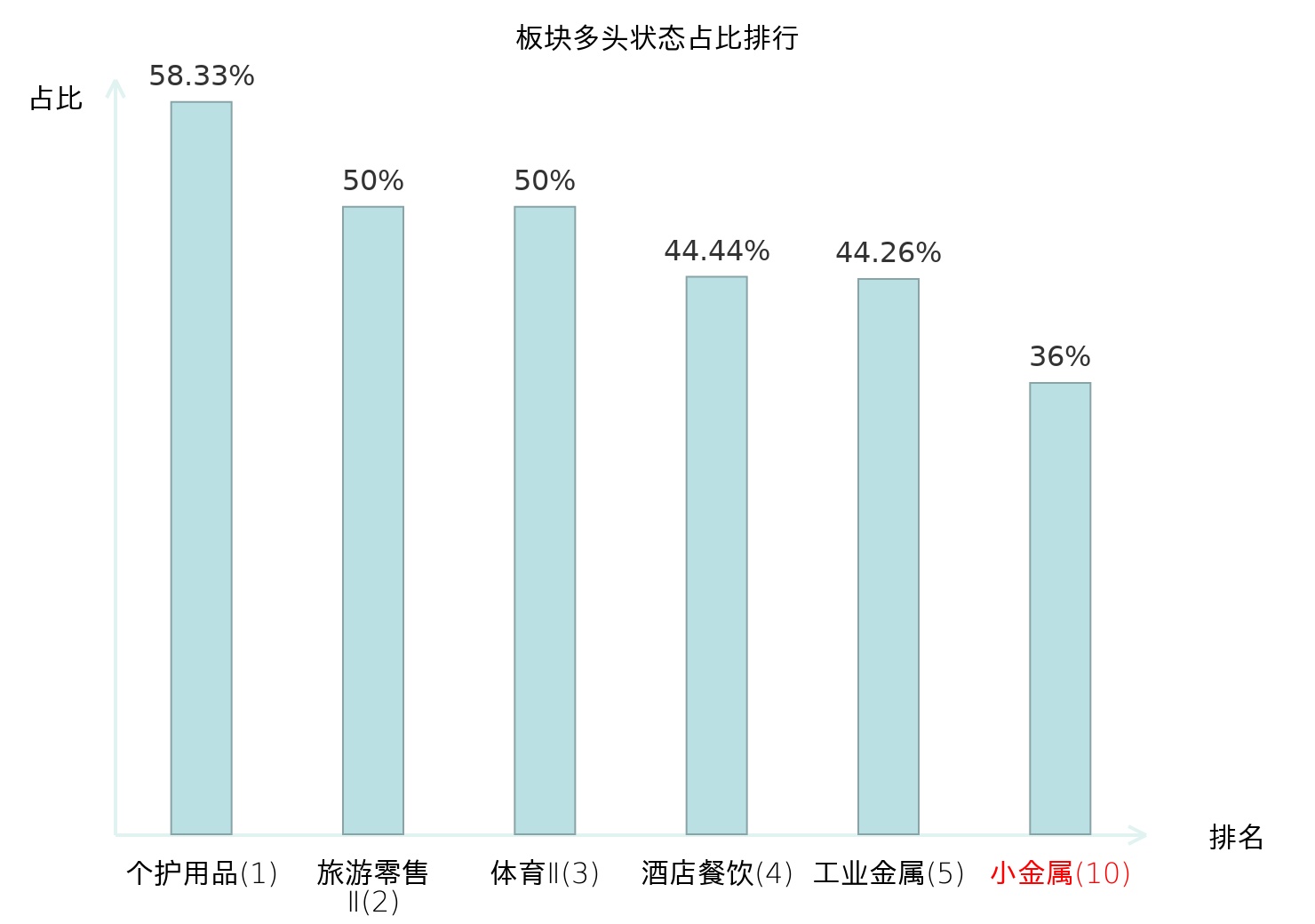 全市场所有行业板块中主力多头状态占比排名中,个护用品板块位居第一。非白酒板块名次提升最快,较昨日上升65位。