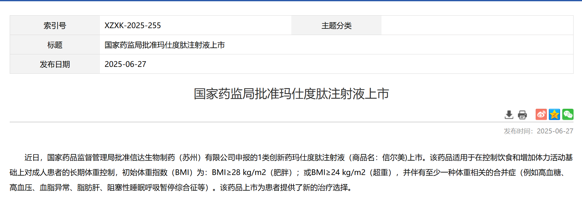 中国国家药监局(NMPA)宣布批准信达生物申报的胰高血糖素(GCG)/胰高血糖素样肽-1(GLP-1)双受体激动剂玛仕度肽注射液(简称:玛仕度肽)上市,用于成人肥胖或超重患者的长期体重控制。