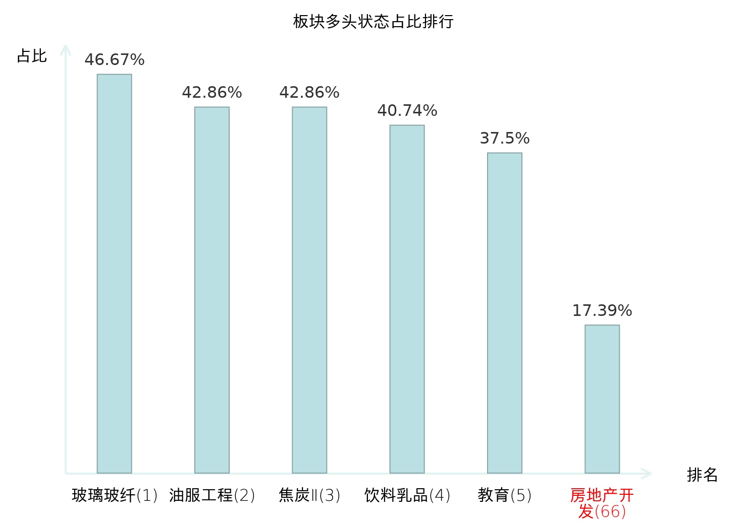 全市场所有行业板块中主力多头状态占比排名中,玻璃玻纤板块位居第一。航空机场板块名次提升最快,较昨日上升43位。