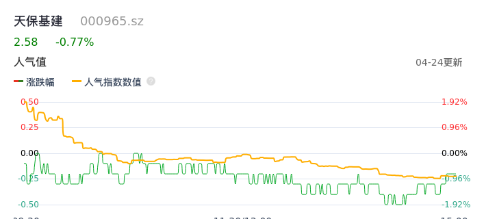 04月24日,天保基建收报2.58,股价涨幅-0.77%,成交金额4331.63万元,换手率1.52%。