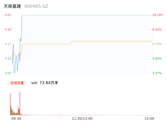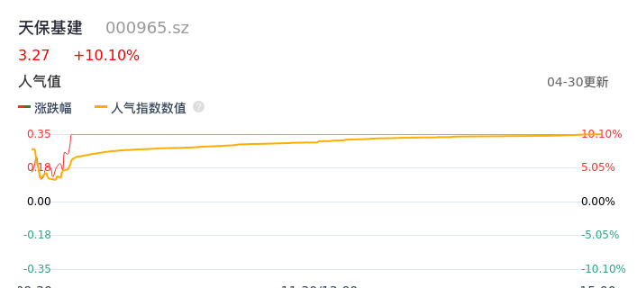 04月30日,天保基建收报3.27,股价涨幅10.10%,成交金额2.35亿元,换手率6.65%。