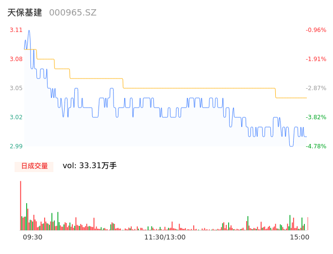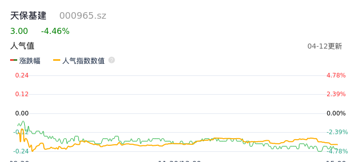 04月12日,天保基建收报3.00,股价涨幅-4.46%,成交金额1.01亿元,换手率3.00%。