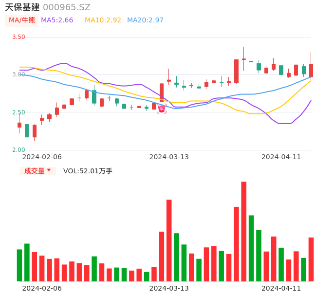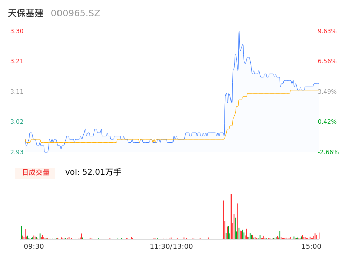 04月11日,天保基建收报3.14,股价涨幅4.32%,成交金额1.62亿元,换手率4.69%。