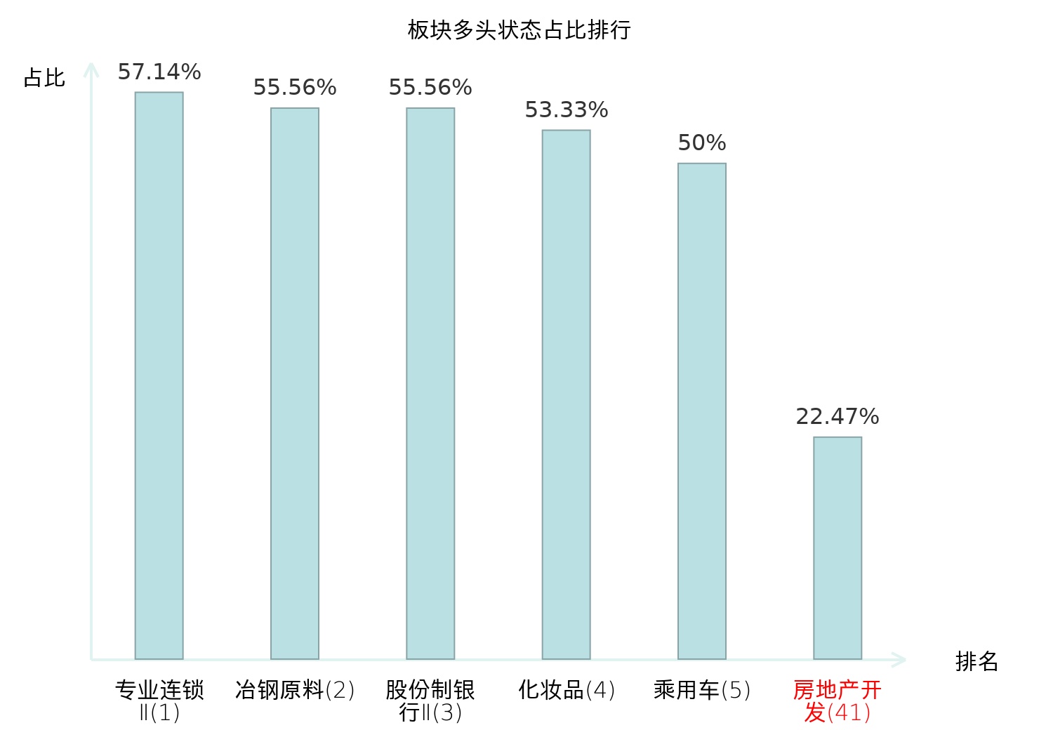 全市场所有行业板块中主力多头状态占比排名中,专业连锁Ⅱ板块位居第一。房地产服务板块名次提升最快,较昨日上升52位。