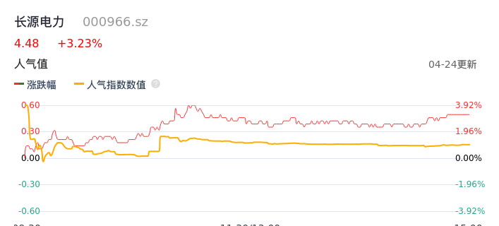 04月24日,长源电力收报4.48,股价涨幅3.23%,成交金额1.13亿元,换手率1.95%。
