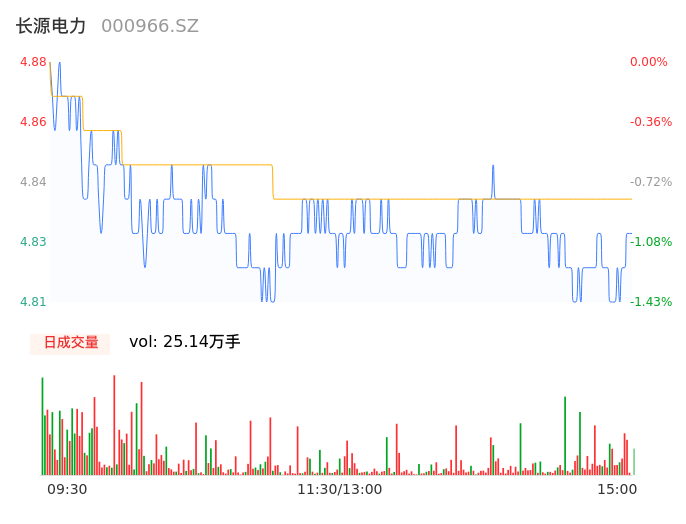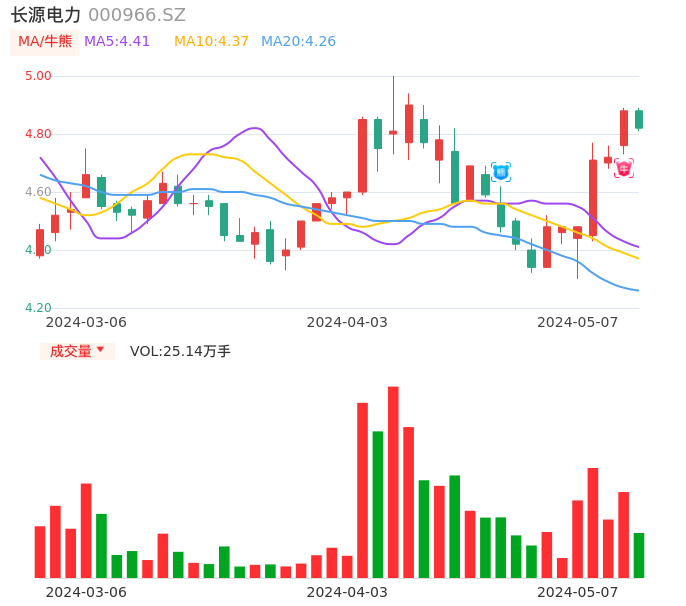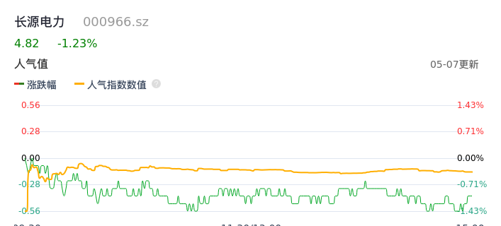 05月07日,长源电力收报4.82,股价涨幅-1.23%,成交金额1.22亿元,换手率0.91%。