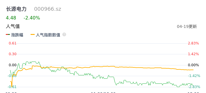 04月19日,长源电力收报4.48,股价涨幅-2.40%,成交金额1.38亿元,换手率2.32%。