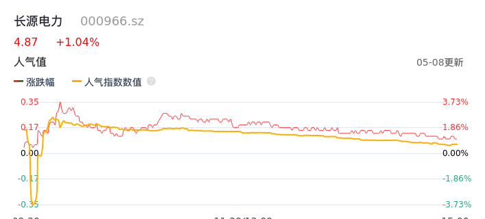 05月08日,长源电力收报4.87,股价涨幅1.04%,成交金额2.94亿元,换手率2.17%。