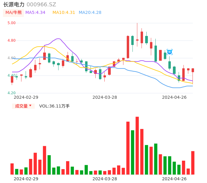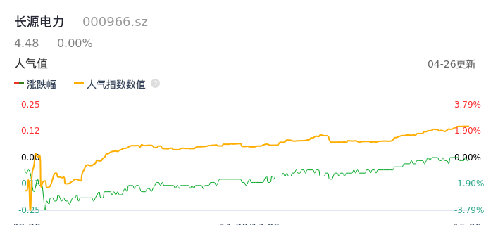 04月26日,长源电力收报4.48,股价涨幅0.00%,成交金额1.59亿元,换手率2.76%。