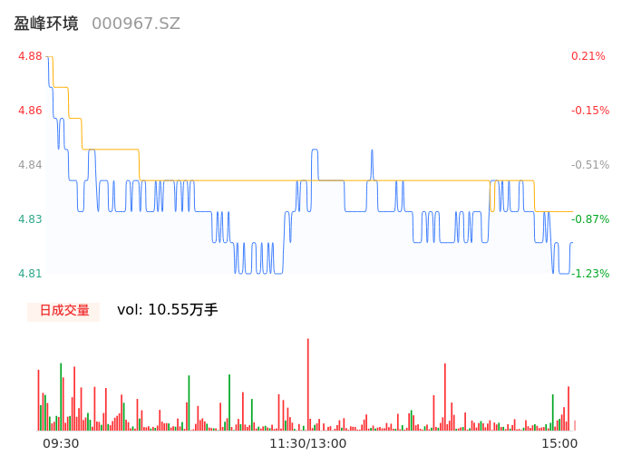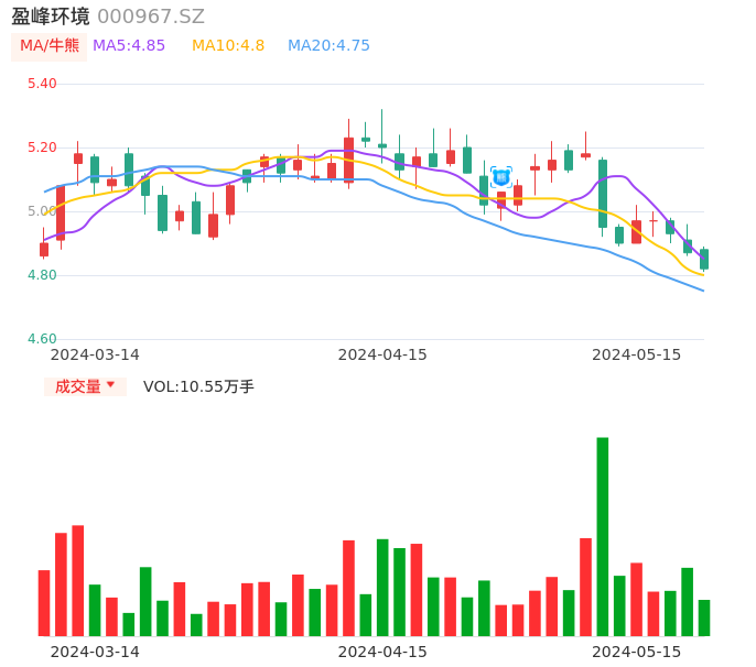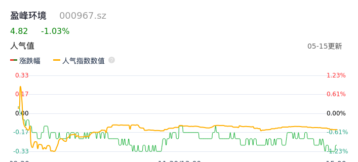 05月15日,盈峰环境收报4.82,股价涨幅-1.03%,成交金额5099.32万元,换手率0.33%。
