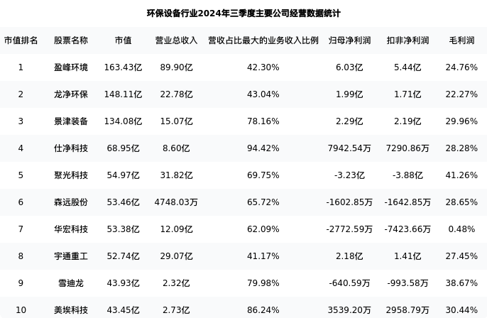盈峰环境最新报告期数据为三季度,下表汇总了环保设备行业内市值靠前的公司三季度主要经营数据