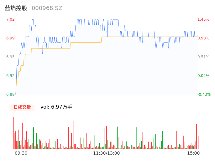 05月09日,蓝焰控股收报6.99,股价涨幅1.01%,成交金额4870.19万元,换手率0.72%。