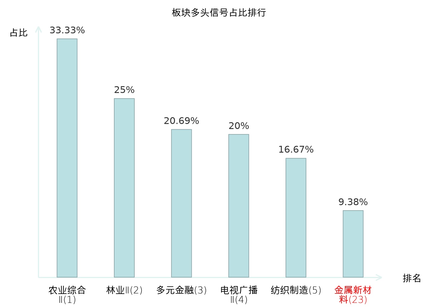 全市场所有行业板块中主力多头信号占比排名中,农业综合Ⅱ板块位居第一。农业综合Ⅱ板块名次提升最快,较昨日上升127位。