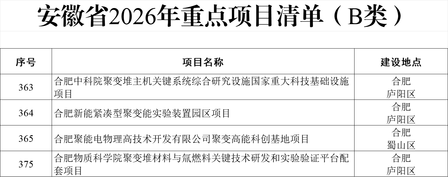 安徽省以合肥为核心,依托大科学装置集群与全链条产业生态,在可控核聚变领域形成独特竞争力。《安徽省2026年重点项目清单》共纳入488个A类项目、1318个B类项目,其中4个可控核聚变相关项目入选B类重点项目,包括“合肥中科院聚变堆主机关键系统综合研究设施国家重大科技基础设施项目”“合肥新能紧凑型聚变能实验装置园区项目”等。