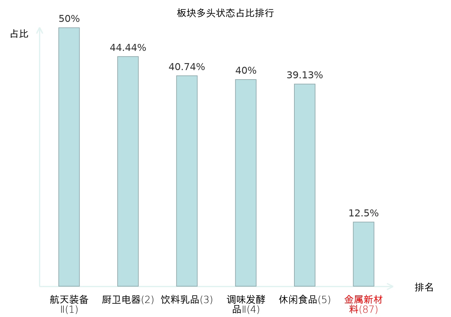 全市场所有行业板块中主力多头状态占比排名中,航天装备Ⅱ板块位居第一。林业Ⅱ板块名次提升最快,较昨日上升92位。
