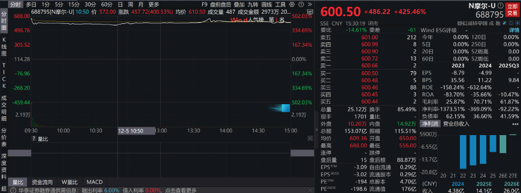 今日市场的绝对焦点是被称为“国产GPU第一股”的摩尔线程正式登陆上交所科创板。该公司发行价高达114.28元/股,为近一年A股上市新股之最。上市首日,其股价表现极为抢眼,截至收盘,报600.50元/股,涨幅高达425.46%,总市值达到2823亿元。盘中其股价一度大涨超500%。该股半日成交额已达125.9亿元,位居A股第一,全天成交额达153.1亿元。