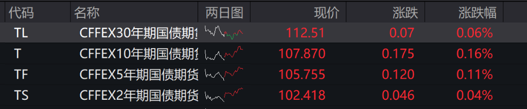 国债期货收盘全线上涨,30年期主力合约涨0.06%,10年期主力合约涨0.16%,5年期主力合约涨0.11%,2年期主力合约涨0.04%。